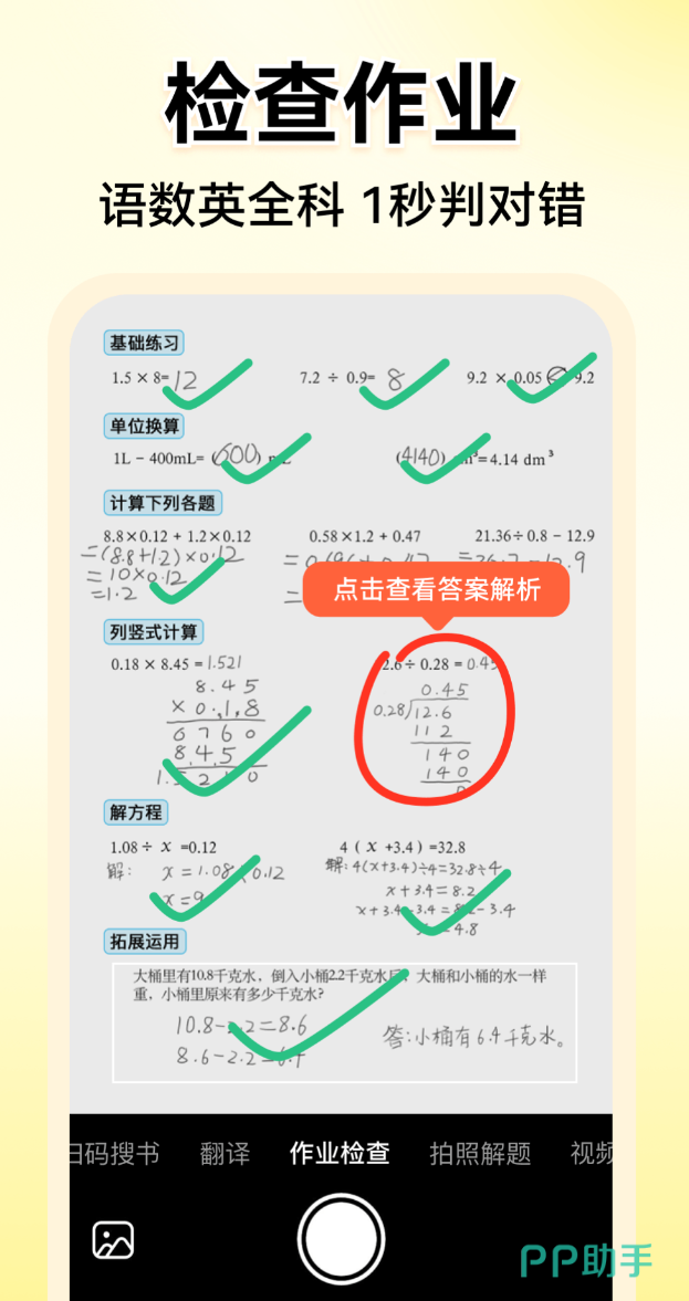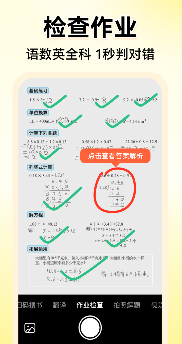拍照批改的识别率稳定,题型覆盖范围宽,不只是口算题,竖式计算、应用题、判断题都能处理,语文和英语的作业也支持检查。练习模块按学龄阶段划分,题库量大,手写作答也可以识别,操作上没有太多障碍。错题拍一下就能看到解题思路,知识点解析写得比较细,家长辅导的时候思路也更清晰,不用自己从头想怎么讲。