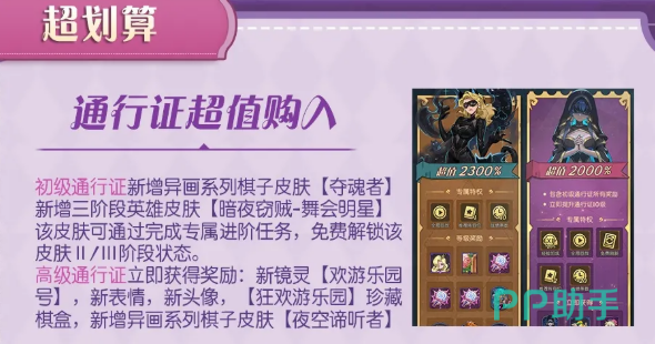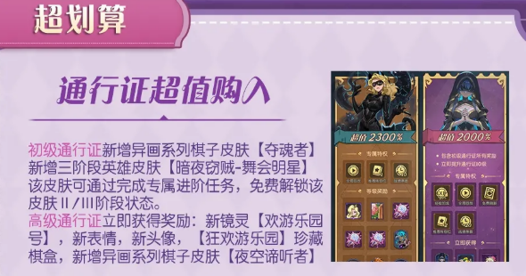 通行证这次也更新了不少内容。初级通行证新增了异画系列棋子皮肤【夺魂者】,还有三阶段英雄皮肤【暗夜窃贼-舞会明星】,完成专属进阶任务可以免费解锁皮肤的第一阶段状态。高级通行证立即获得的奖励包括新镜灵【欢游乐园号】、新表情、新头像,还有【狂欢游乐园】珍藏棋盒,以及异画系列棋子皮肤【夜空谛听者】。