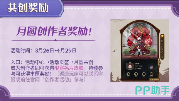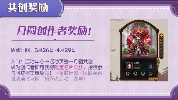 先说共创活动。3月26日到4月29日期间,只要成为创作者,就能拿到限定名片皮肤。后续持续参与的话,还有更多奖励可以拿。入口在活动中心的活动页签里,找"月圆共创"就能看到。