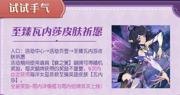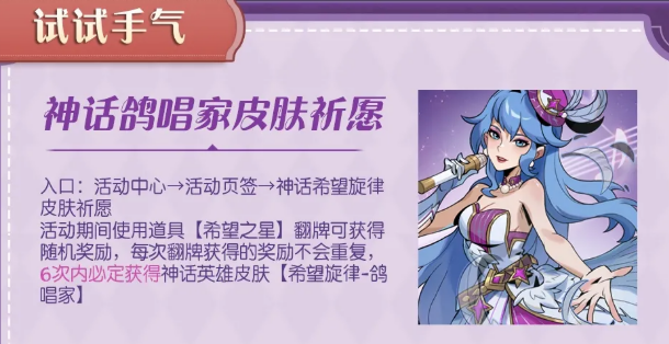 神话皮肤祈愿这边,活动期间使用道具【希望之星】翻牌,可以获得随机奖励,而且每次拿到的奖励都不会重复。最多6次之内,必定能拿到神话英雄皮肤【希望旋律-鸽唱家】。想要神话皮肤的玩家可以冲一下。