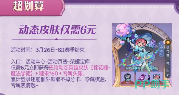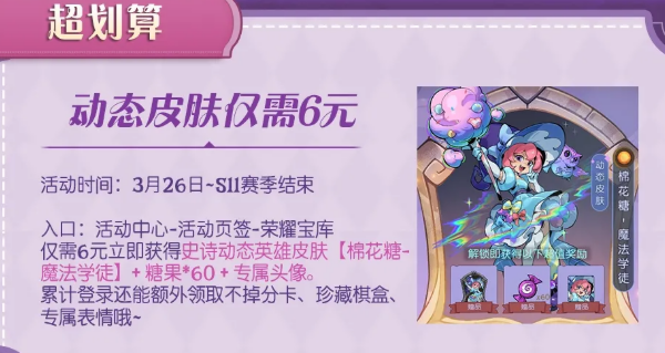 荣耀宝库这边,只需要6元就能拿到史诗动态英雄皮肤【棉花糖-魔法学徒】,还附带糖果×60和专属头像。之后累计登录还能额外领取不掉分卡、珍藏棋盒、专属表情。这个价格拿动态皮肤,算是非常划算了。
