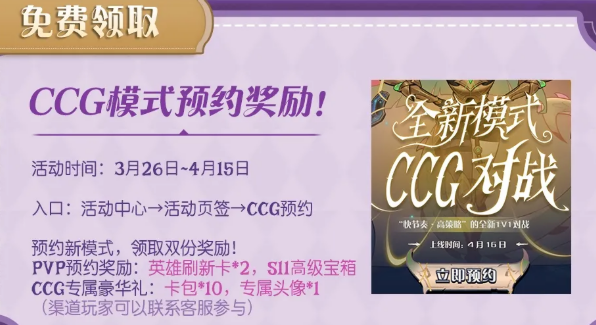 CCG模式预约奖励也在这次版本里。时间是3月26日到4月15日,预约新模式可以拿到双份奖励。PVP预约奖励是英雄刷新卡×2,还有S11高级宝箱。CCG专属豪华礼则是卡包×10加上专属头像。