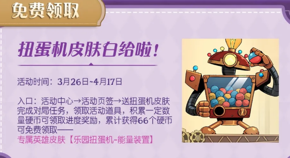 然后是扭蛋机皮肤免费领的活动,时间是3月26日到4月17日。完成对局任务之后,会拿到活动道具,积累到66个硬币,就能免费领取专属英雄皮肤【乐园扭蛋机-能量装置】。这个皮肤直接白给,任务也不算太难,建议优先去做。