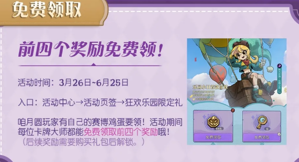 狂欢乐园限定礼这个活动,时间拉得比较长,从3月26日一直到6月25日。活动期间,每位卡牌大师,都能免费领取前四个奖励,后面的奖励需要购买礼包才能解锁。前四个免费拿就行,不想花钱的玩家也能参与。