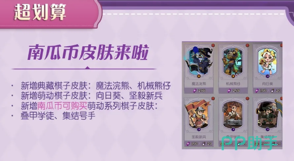 南瓜币皮肤这次也做了更新。新增了典藏棋子皮肤:魔法浣熊和机械熊仔。萌动棋子皮肤新增了向日葵和坚毅新兵。另外,南瓜币现在也可以用来购买萌动系列棋子皮肤,包括叠甲学徒和集结号手。