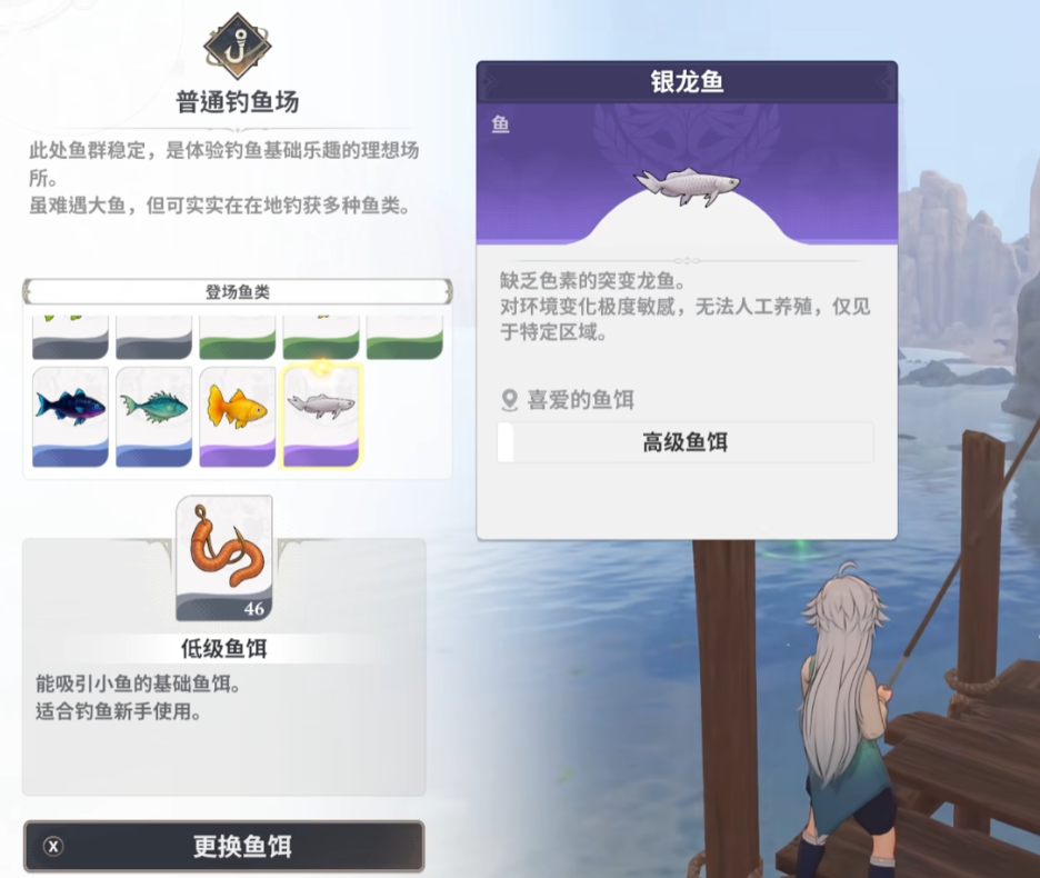 银龙鱼以银白色鳞片而闻名,在阳光下会发出耀眼的光芒,是沿海钓鱼场里不可多得的珍品,也是制作某些海洋主题道具所必需的材料。