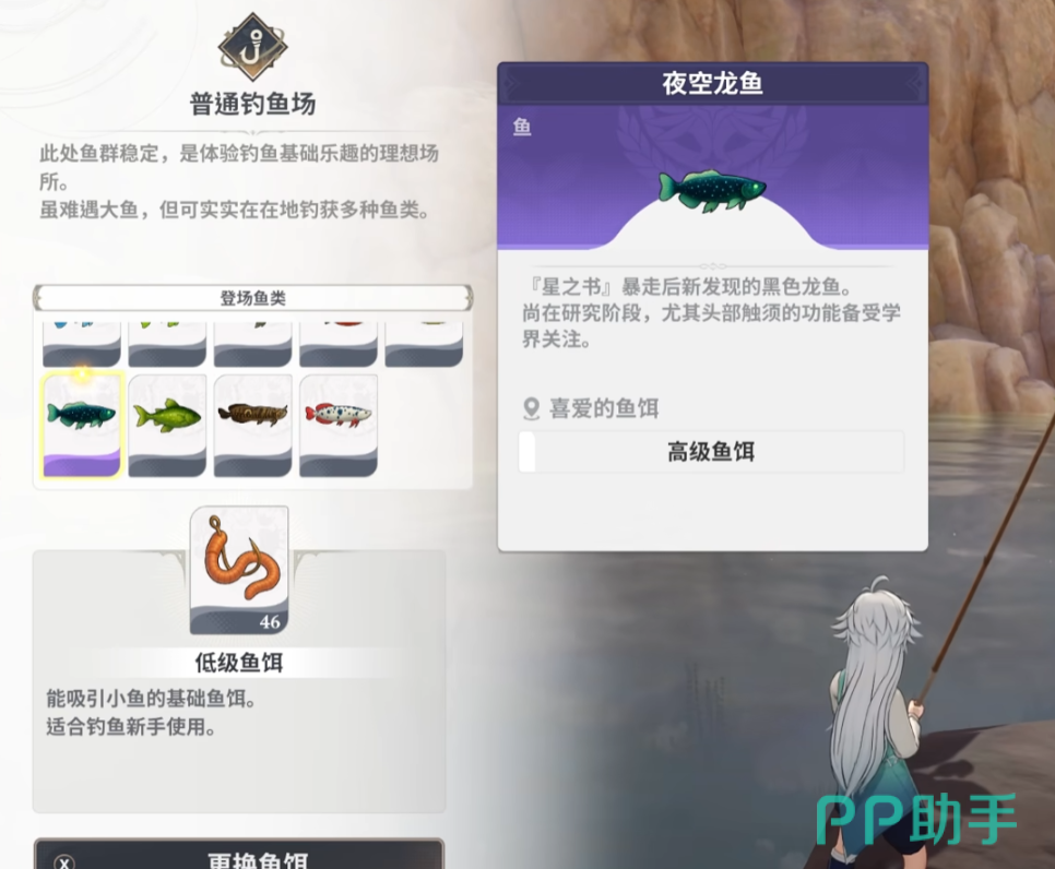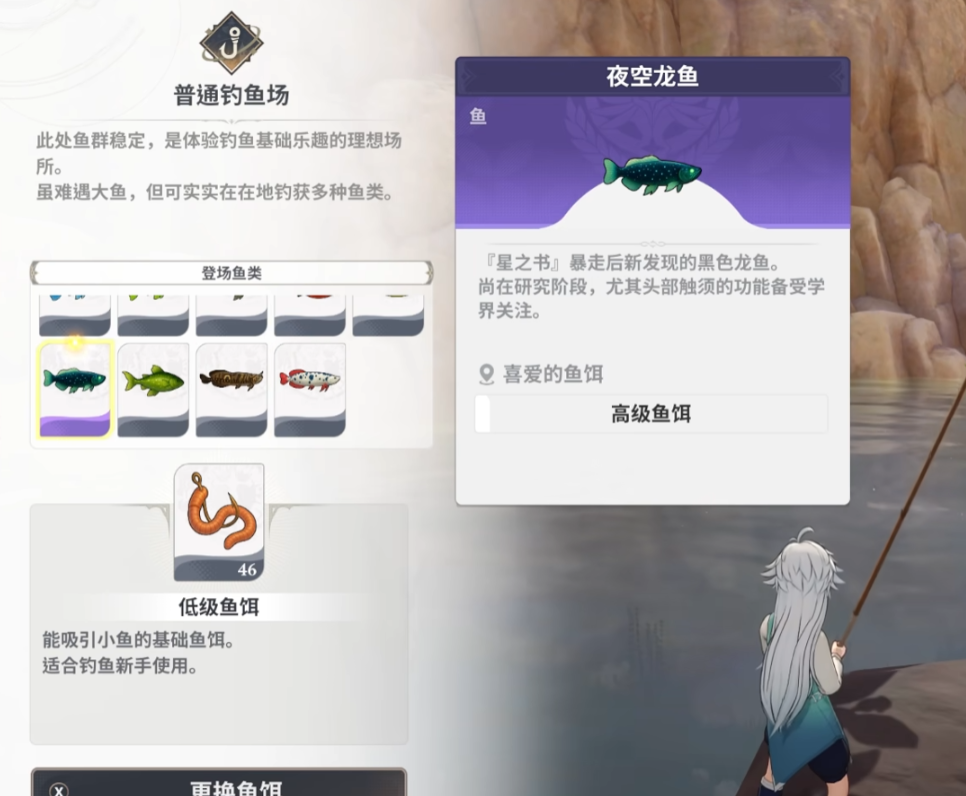 同样栖息在森林区的还有夜空龙鱼。虽然它和角龙鱼一样可以在森林关卡的普通钓鱼场得到,但是它们的生态习性却大相径庭。夜空龙鱼把天上的星辰融入到鳞片里,在夜晚垂钓的时候更容易找到它的踪迹。森林关卡属于游戏早期或者中期的区域,玩家对它的地形比较熟悉,这就为夜空龙鱼的捕捉创造了条件。玩家在森林主线任务空闲的时候,在密林树冠之下可以找到类似夜空般的深邃鱼影,在安静的森林里独自垂钓。