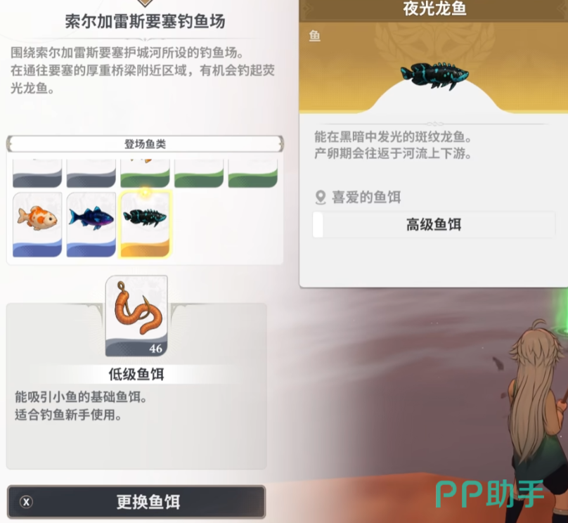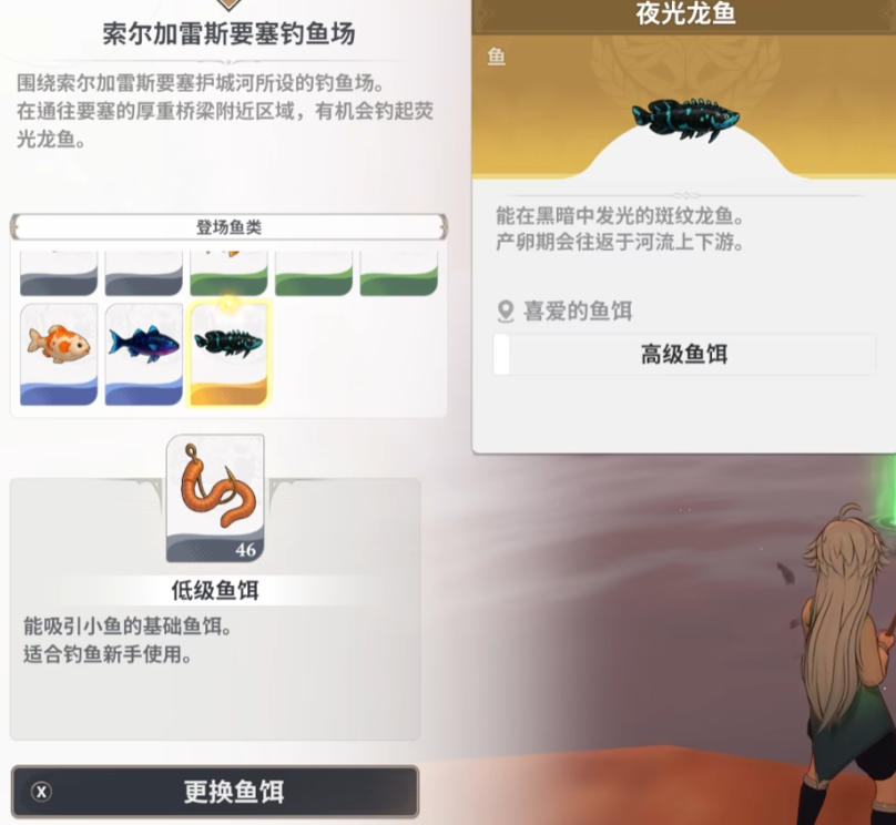 夜光龙鱼全身有幽幽的冷光在光线昏暗的时候才活动。索尔加雷斯要塞是军事重地或者古代遗迹,周围存在着强大的敌人,给钓鱼活动带来了新的危险。