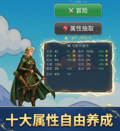 关卡的设计还是比较用心的,地形还有敌人的配置,确实会巧妙的结合在一起。养成系统就会让冒险充满乐趣,攻击,暴击,闪避,吸血等一系列属性就会自由的成长。每提升一级,每一次强化装备,大家都能感受到战斗力明显的提升。游戏里面还有很多的弓箭以及防具可以选择,例如普通的弓箭,还有火焰弓箭,每一个属性都并不一样。你可以根据战斗的风格去搭配,在打败敌人,完成关卡之后,就可以解锁强力的技能,例如穿透射击,还有万箭齐发。