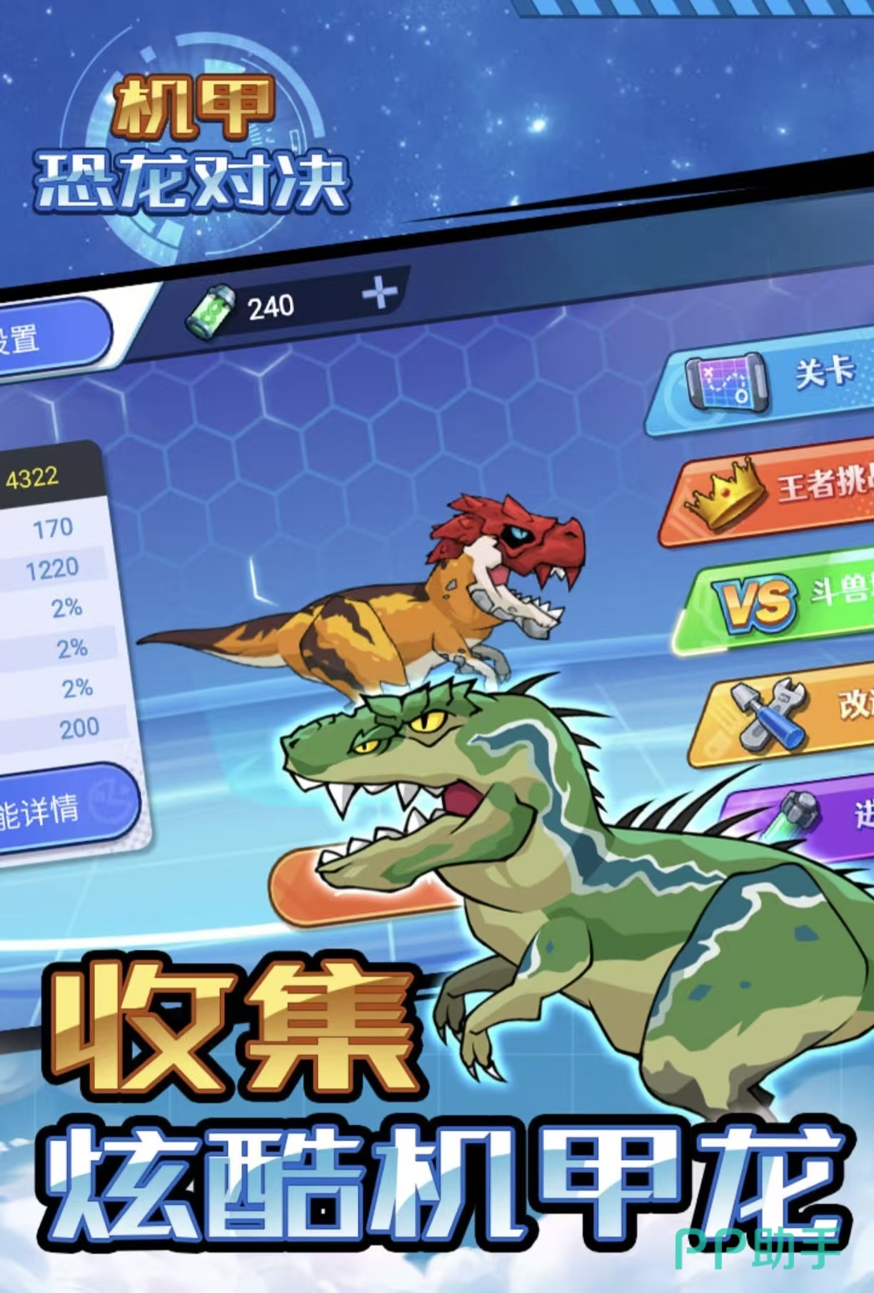 《机甲恐龙对决》打造了一个机甲科幻风格的场景,众多的恐龙角色在这里进行战斗对决,这些恐龙角色可以进行进阶。通过任务的方式收集到更多碎片,用这些碎片来强化恐龙的能力,这里的作战技能可以自由组合,可以参加冒险闯关的方式,也可以在斗兽场上或者是副本中PK,不断的获得更多新的恐龙装备,让恐龙成为更强大的角色。