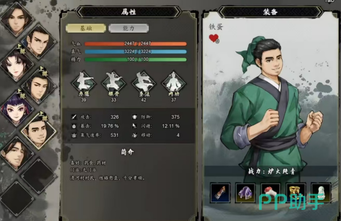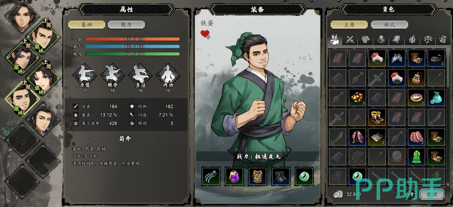 铁蛋刚入队的时候,只会一种武学,就是连山掌法里的一招,说实话挺普通的。他属于那种需要慢慢培养的队友,不是一开始就很能打的类型。不过他有一点还不错,四维思维属性比初始主角要高,前期用起来感觉还行。后期的话,可以通过学习功法来提升他的实力,像连山掌法、大金刚拳、般若金刚掌这些比较厉害的武学,铁蛋都能学。靠着分配武学点和强化装备,慢慢把他养起来,战斗力还是能上去的。