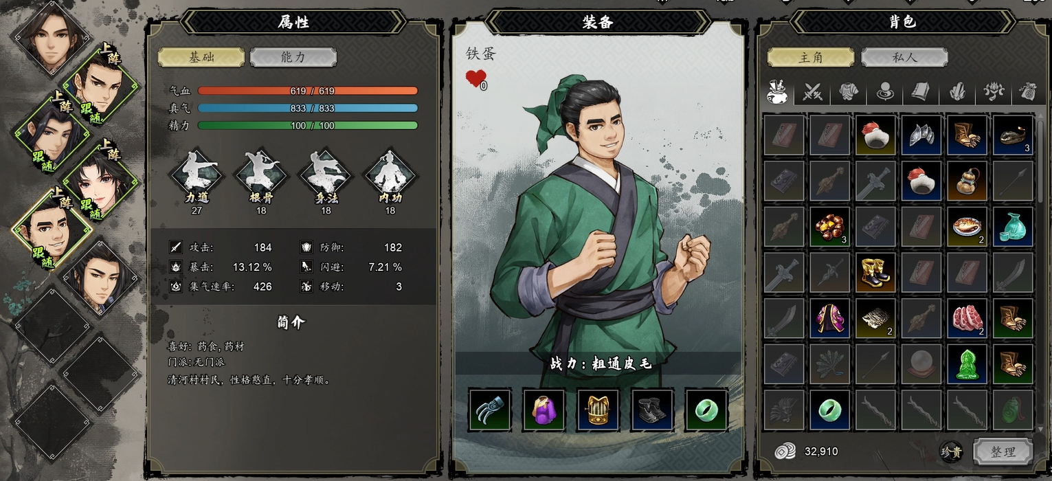 除了战斗之外,铁蛋还有一个小用途,就是当队伍里的抄书匠。队伍里有武学点积累的时候,他可以撰写心得,相当于给队伍提供一种辅助支持。虽然这个功能不是特别显眼,但用好了也是一种资源积累的方式。