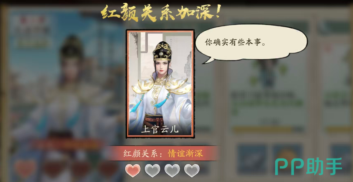 最后第二章节的攻略度也是影响到大家是否能够拿到这个红颜角色的,只要达成其中辞官的故事情节,在这里就算是通关第二章节了,后期大家还可以在专属的红颜系统当中看到女装的上官云儿,而通过各种出游以及赠送物品还可以增加她在红颜系统当中的好感度,这类玩法就跟在主线里面,大家拿到的门玩法差不多,都是可以带来赚钱速度加成的,而且红颜其实跟大家后取的门客放在一起加成的话,大家还可以看到其中出现的羁绊加成能力。