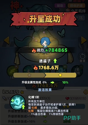 他的核心机制其实不难理解。简单说就是,每次给队友加血或者加护盾,全队就会获得一次暴击率和攻击力的提升。这个触发条件非常宽松,不需要打普攻,也不需要满足什么特殊条件,只要正常用技能辅助队友,增益就会自动叠上去。而且这个加成会随着逍遥子的星级一起变强,所以后期升星之后效果会更明显。