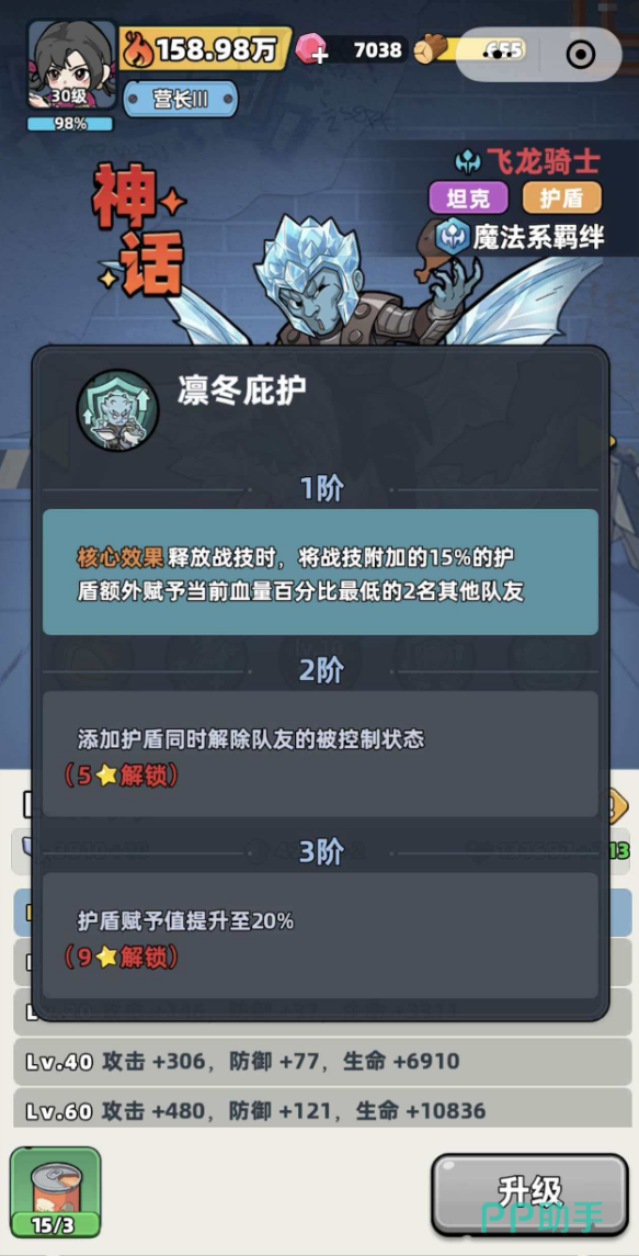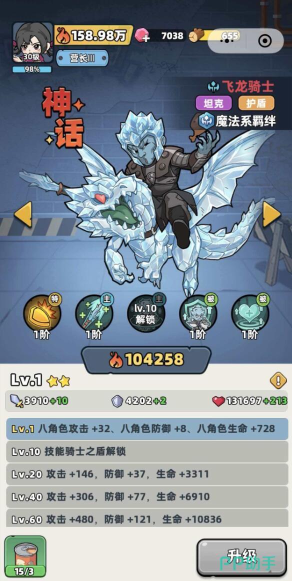 飞龙骑士归属于魔法系羁绊体系,本质为高容错率的前排护盾坦克。其基础坦度在同阶角色中处于顶尖水平,生命值、防御力与抗性成长曲线稳定,从1级至60级全程保持线性提升。除自身生存能力外,该角色还能为全队提供固定比例的基础属性加成,形成“一人上阵,全员受益”的协同效应,在多波次高强度战斗中显著提升队伍整体续航能力。