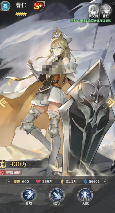第二个为大家推荐的叫做曹仁,曹仁目前在前期的护盾效果当中带来的保护能力是非常强的,通过她的主动攻击这类能力,可以对单体的敌人造成200%的数值伤害之后,给我方的队友带来一个增益,上面是根据生命数值的5%带来一个护盾,护盾能力在这里是会持续两个回合,另外在施加护盾的时候,对于给这名队友施加护盾之前她身上的减益状态,曹仁还可以直接通过转移的方式来拿到自己身上,而她减益的影响效果是不用害怕的,因为自身可以承伤的数值是比较强的。