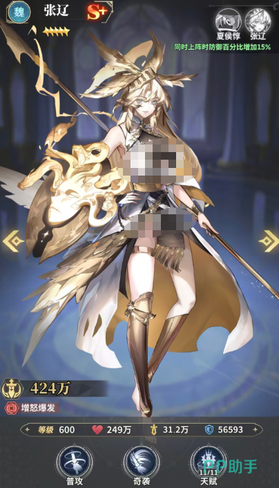 今天为大家推荐的第一个强势武将就是张辽,张辽一般是跟夏侯惇一起放在阵容当中使用,因为她们俩同时上阵的话,对于防御数值上面的百分比是有15%的羁绊增加,放在队伍中的话大家一眼就可以看出来,张辽是放在前排用的,她可以带来的能力在群体的伤害当中,是带来群体的70%伤害,之后可以根据技能,对面目标每减少一个的时候,张辽在技能伤害上面就会提升20%,所以在这里她每一次输出的时候,对面技能目标减少掉一个敌人之后,她伤害提升的百分比就会非常多,另外她在成功击杀了对面的武姬之后,自身怒气也会得到两点的加成,虽然每个回合里面只能用一次,但是这一点也保证了她后期在怒气大招的释放效果上面不会受到影响,放在这里用的话她升星到九星这,类能力就可以体现出来了。