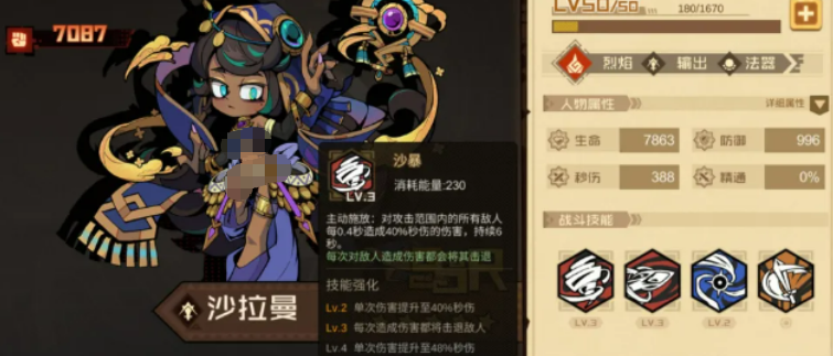 而另外沙拉曼在这里,她在输出效果当中具有非常强势的爆发能力,大招能力当中就具备了15段的连续攻击,每一次攻击当中都带有独特的伤害判定,击中的概率都达到了600%的倍率加成,而且每一段命中敌人的时候,都可以触发这里天罚之日的被动,累积拿到450%的加成之后,她的秒伤加成倍率也会达到1050%左右的提升,然后配合天罚之日之类的主动技能来进行整体战斗提升的话,其实利用到的机制也是比较多的,沙拉曼自动的技能效果当中带来的沙暴,也可以为其中带来更高的穿透性,这个技能只有7秒时间,后期命中多个目标之后,每一段穿透伤害能力都可以让她独立触发更多的被动加成,而且如果攻击的敌人处于燃烧状态当中的话,她的技能伤害还会进一步提升起来,当然在被动效果当中,浮游剑释放概率是需要跟队友一起协同触发的,而且全队自动技能效果在此时也成为了沙拉曼主要输出的一个方式,后期在技能的覆盖密度上面会更高一些。