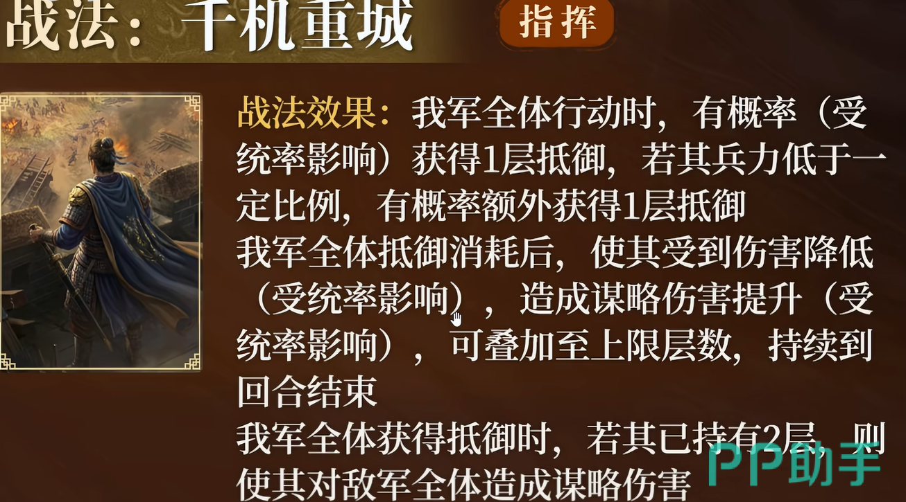 郝昭的自带战法叫千机重城,是指挥类型的。这个战法的逻辑不复杂,但实际效果很可观。简单说就是,我方全体在行动的时候,有概率给自己加一层抵御,如果兵力掉到一定程度以下,还有概率额外多加一层。抵御这个东西用完之后,会让这个武将受到的伤害降低,同时提升造成谋略伤害的能力,这两个效果都是可以叠加的,上限有一定层数,持续到那个回合结束为止。另外还有一个触发条件,就是当某个武将身上的抵御达到两层的时候,会对敌方全体造成一次谋略伤害。这套机制整体下来,既能给自己减伤,又能顺带输出,两头都顾到了。