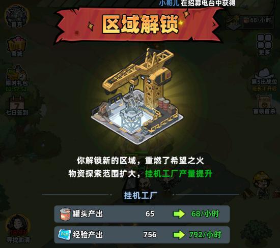 基地也可以不断升级,扩充设施,提升挂机的产出,像是罐头、经验这些,解锁的区域越多挂机产出效率越高。系统还有各种任务指引和击杀成就,一些boss级的怪物可不能硬抗,需要操作团队规避范围攻击。