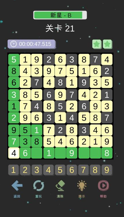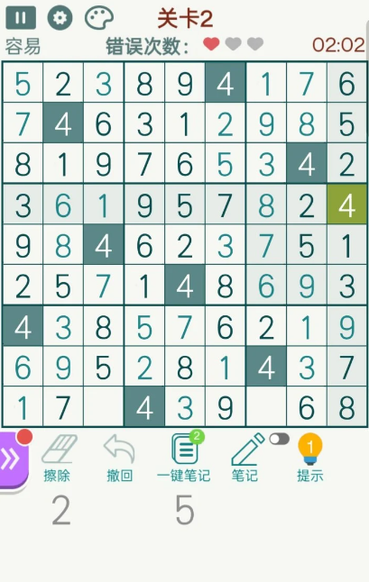 整体画面看着清爽舒服,不会弹出各类广告,就算断开网络也能正常单独玩,页面底色柔和耐看,长时间玩眼睛也不容易累,很适合日常放在手机里随时消遣。游戏划分了由易到难的多种闯关难度,自带实用贴心辅助设置,可给出数字提示和随手记录草稿,自动找出填错和重复数字,题库数量充足,随机生成各类新题,不用担心很快玩完。