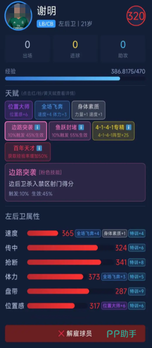 最后推荐左后卫谢明,最高评分为320分,适配多种战术阵型。其核心打法为边路突袭——作为后卫主动前插至禁区完成射门,当前生效概率已达45%。通过专精加点与特训,该技能命中率可持续提升。“百年天才”天赋使其经验获取速度提升50%,身体属性成长更快;“全场飞舞”则同步增强速度与体力,显著提升往返覆盖能力,是兼具攻防弹性与培养性价比的优质边卫人选。