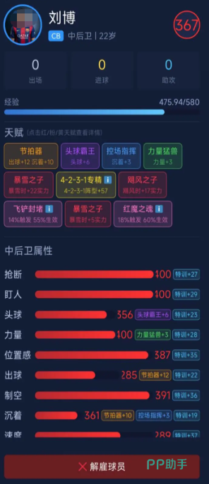 首位推荐球员为中后卫刘博,当前综合评分为360分,成长路径清晰,经验获取效率较高。其核心天赋“节拍器”可提升出球能力12点,“沉着”则强化场上决策稳定性。关键防守属性突出:抢断、盯人、位置感与制空四项均达高水准,赋予其出色的区域控制与指挥能力。随着潜力开发,其“转基因”效果可进一步激活飞铲封堵机制,在前锋发起射门时及时协防补位,保障后场安全。