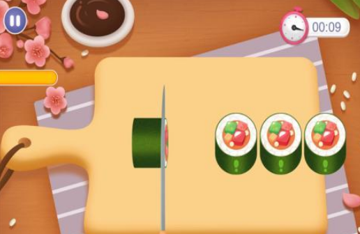 以日式寿司制作为主线,设置小猫、鸭子等拟人化顾客角色。孩子需根据订单要求选择对应食材(如海苔、米饭、鱼片)、搭配酱料并完成卷制与切分动作,过程中强化顺序意识、数量感知与任务执行能力,同时了解不同食物的文化背景。