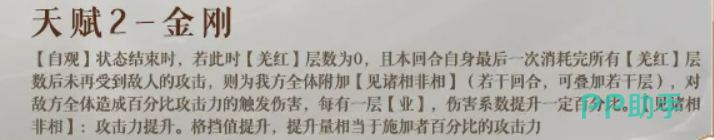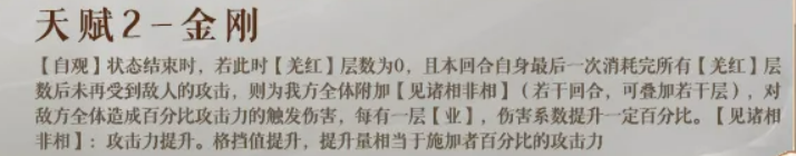 天赋“金刚”构成整套机制的终局爆发点。当【自观】状态自然结束时,若满足两个严苛条件——一是【羌红】层数恰好归零;二是最后一层【羌红】消耗完毕后,本回合内未再受到任何敌方攻击——即可激活该效果:为全体友方附加增益状态【见诸相非相】,并对全体敌人造成一次高额触发伤害。该伤害的基础倍率随【业】层数线性提升,而【见诸相非相】则同步提升全队攻击力与格挡值,两项增益数值均以施加者攻击力为计算基准。