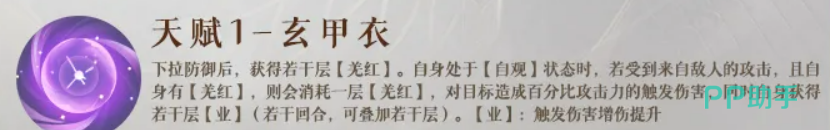 天赋“玄甲衣”强化了马腾的受击转化能力。当执行下拉防御动作后,可获取若干层【羌红】。若在【自观】状态下受到敌方攻击,且当前持有【羌红】,则自动消耗一层,对攻击者造成一次触发伤害,并为自身叠加若干层【业】。“业”可跨回合累积,持续固定回合数。每层【业】均提升后续触发伤害的倍率系数,从而形成“越被攻击→越快消耗【羌红】→越高频触发→【业】叠得越高→单次爆发越强”的正向反馈链。