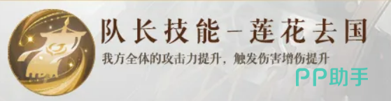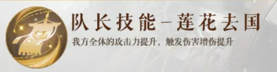 队长技“莲花去国”提供全局增益:提升全队攻击力,并同步增强所有触发类伤害的倍率。该效果与马腾自身依赖触发伤害的输出路径高度契合,使其担任队长时,不仅能强化团队整体输出,更能显著放大自身核心爆发与辅助收益。