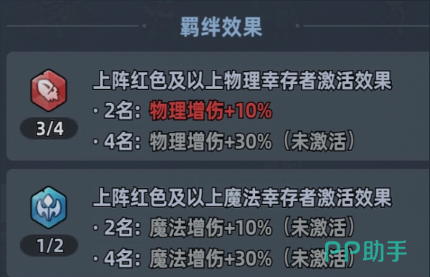 羁绊效果的触发前提是上阵红色品质及以上幸存者,并以职业为单位进行组合。具体规则为:当同职业红品角色达到2名时,激活对应职业10%的伤害加成;数量增至4名时,该增益提升至30%。值得注意的是,羁绊带来的不仅是职业专属伤害增幅,还会同步强化全队基础属性——包括生命上限与攻击力。这种双重增益机制,从根源上缓解了资源分配压力,大幅延长队伍在高压环境下的生存周期。