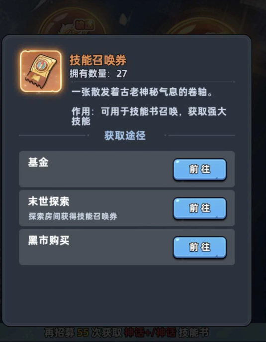 技能书获取主要通过两种稳定渠道:一是使用技能召唤券进行定向抽取;二是通过高难度关卡探索及事件节点完成获得整本掉落。其中,技能召唤券可通过多种途径积累:世界地图探索过程中存在随机拾取概率;亦可在黑市中消耗钻石兑换,但鉴于钻石资源相对稀缺,该方式建议作为补充手段;此外,开通技能书基金后,每次角色进阶均可领取固定数量的召唤券,属于长期性价比更高的获取路径。
