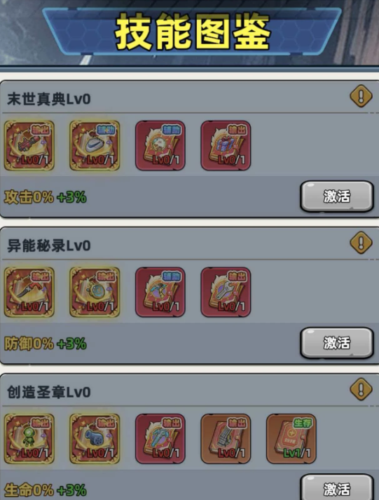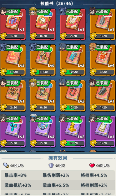 游戏中技能书按功能定位划分为输出型、生存型与辅助型三大类别,稀有度由低至高依次为蓝色、紫色、橙色、红色、金红色共五档。稀有度越高,基础属性加成越显著,且特殊效果的触发概率同步提升。装配时需严格匹配角色职能——例如主输出位优先选择金红或红色输出类技能书;前排坦克则建议搭配橙色及以上品质的生存向技能书。