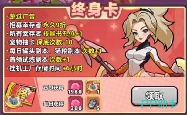 其次,终身卡绑定永久性招募折扣——所有角色抽取时享受9折资源消耗减免。单次节省幅度有限,但在高频抽卡场景下,长期累计可降低约10%的养成成本。更具战略意义的是技能书槽位扩容:激活后,全体幸存者角色额外解锁1个技能书装备位。该机制直接关联战力成长曲线,属于影响角色实战上限的核心强化项。