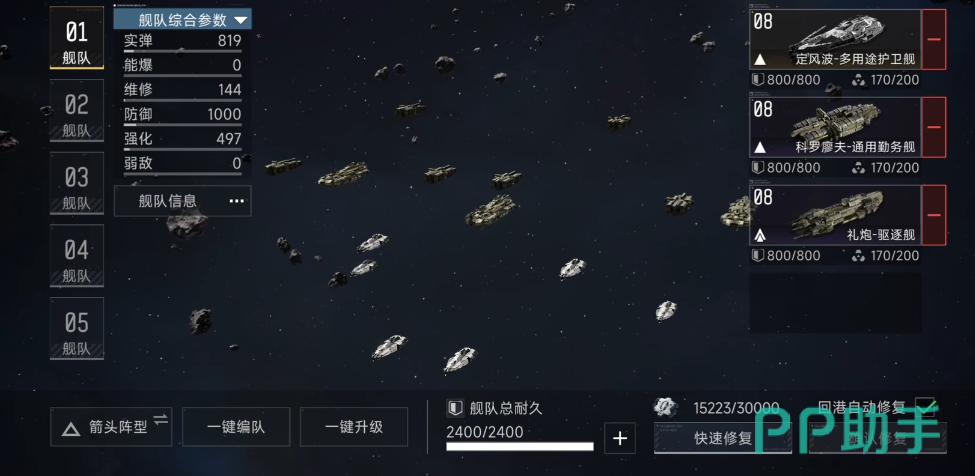 在【编队】模块中,玩家可实时查看全部已拥有战舰的属性详情,包括类型、等级、耐久值、火力输出等关键参数。队伍总耐久度直接决定该编队在PVE扫荡或PVP对抗中的持续作战能力。界面同时支持单舰升级、阵型切换(如三角突袭阵、环形防御阵、菱形突击阵等)以及跨编队快速调换。该机制强调策略适配性——不同任务场景需匹配差异化舰种组合,例如资源采集倾向轻型高速舰,而要塞攻坚则需重装主力舰与支援舰协同作业。