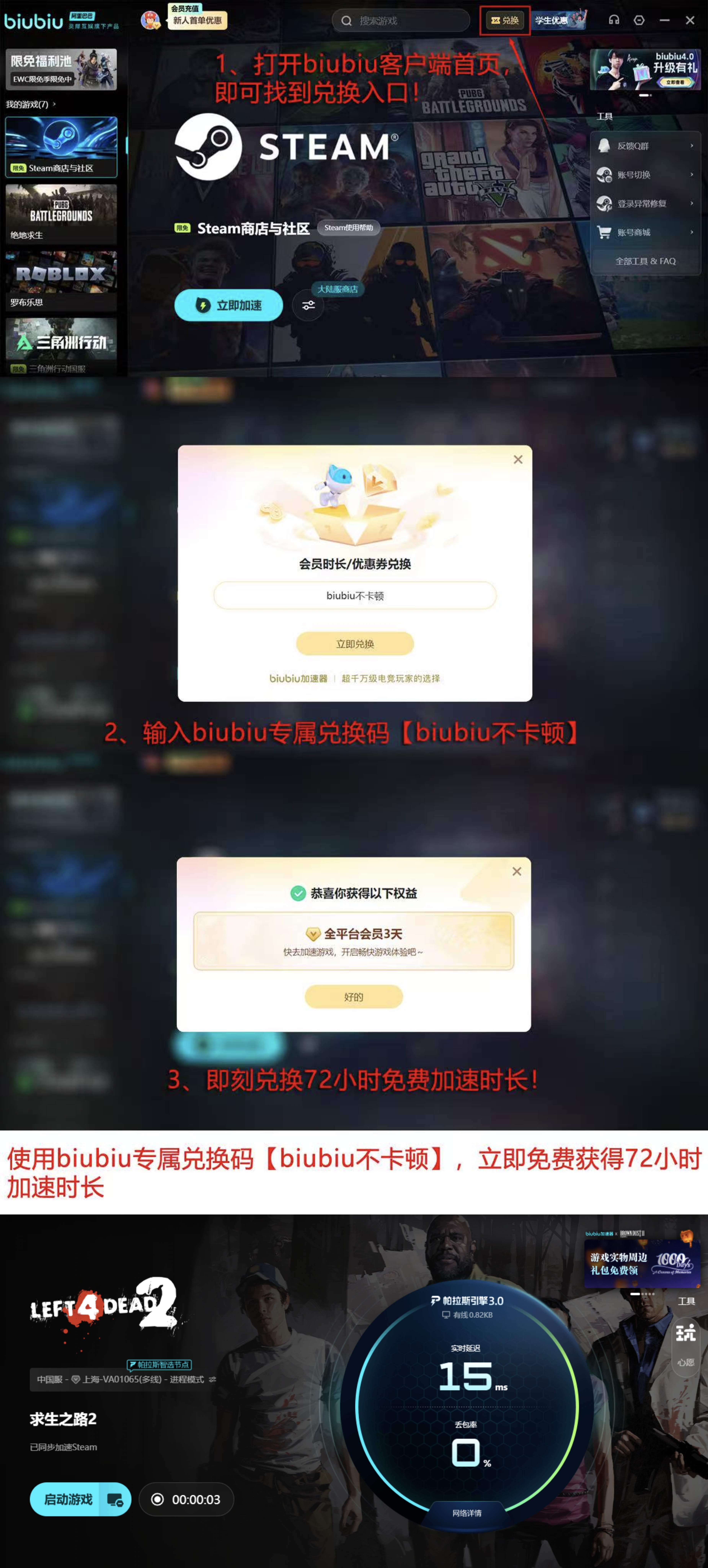 针对新用户,biubiu加速器提供双重免费体验权益:完成注册后即可激活首日24小时全功能加速权限,支持完整通关《求生之路2》任意官方战役;登录客户端后进入兑换中心,输入专属激活码【biubiu不卡顿】,还可额外领取72小时加速时长,总计可达96小时免费使用额度,足以覆盖全部主线章节及主流社区地图的反复联机需求。