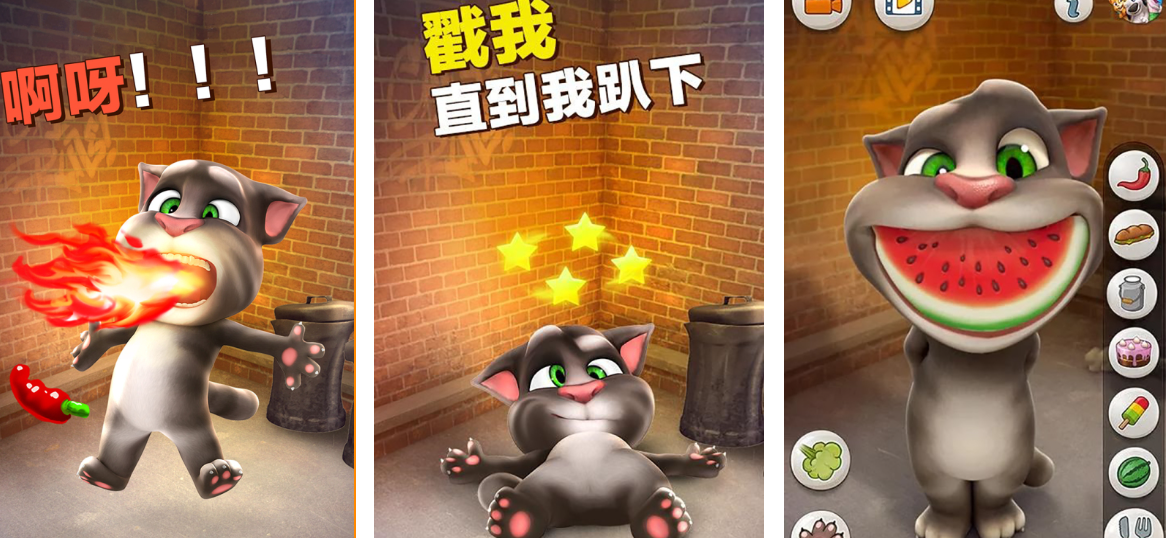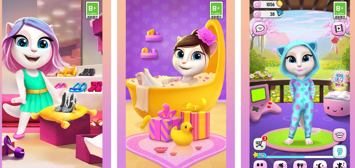 作为整个系列的开山鼻祖,虽然主角是灰色的傻猫汤姆,但是安吉拉是它的官方设定的女朋友,在游戏的互动生态中占有着非常重要的地位。该游戏只用触控反馈、语音乐趣,玩家对着麦克风说出的话,汤姆就会用夸张的语调重复出来,安吉拉会在某些互动环节中出现,以惊喜嘉宾的身份和汤姆一起进行甜蜜的互动。游戏用简单的点击、抚摸、戳弄这些手势,就能产生了许多非常有趣生动的物理反应。