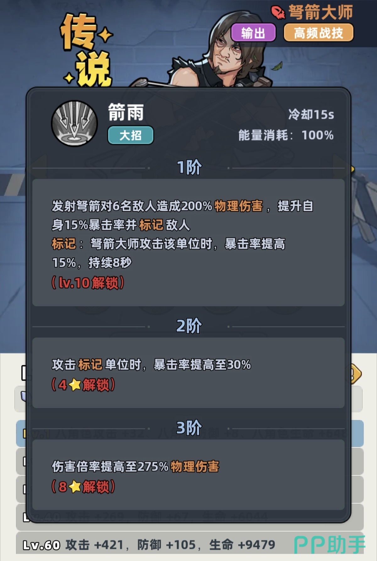 弩箭大师属于典型的高攻速爆发型输出单位,前期即可投入实战,对资源有限的平民玩家尤为友好。其获取门槛较低,升星难度适中,能较快解锁关键被动效果。角色核心机制围绕“暴击—减CD—再暴击”的正向循环构建:战技造成物理伤害并具备暴击加成;大招不仅施加高额物理伤害,还会提升自身暴击率,并对目标施加标记效果;攻击被标记单位时,暴击率进一步提升。此外,普攻暴击有概率缩短战技冷却时间,使技能释放节奏显著加快,整体输出密度远超同阶角色。