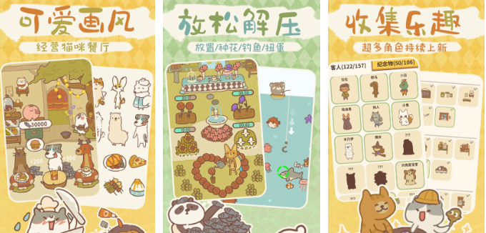 以拟人化动物为主角的轻量级经营游戏,玩家扮演猫店长打理一家森林边的小餐馆。菜品研发、员工培训、顾客对话均采用卡片式交互,动画细腻且富有个性。背景音乐采用八音盒与竖琴编曲,界面图标采用毛绒质感设计,整体视觉语言统一,长期留存率表现优异。