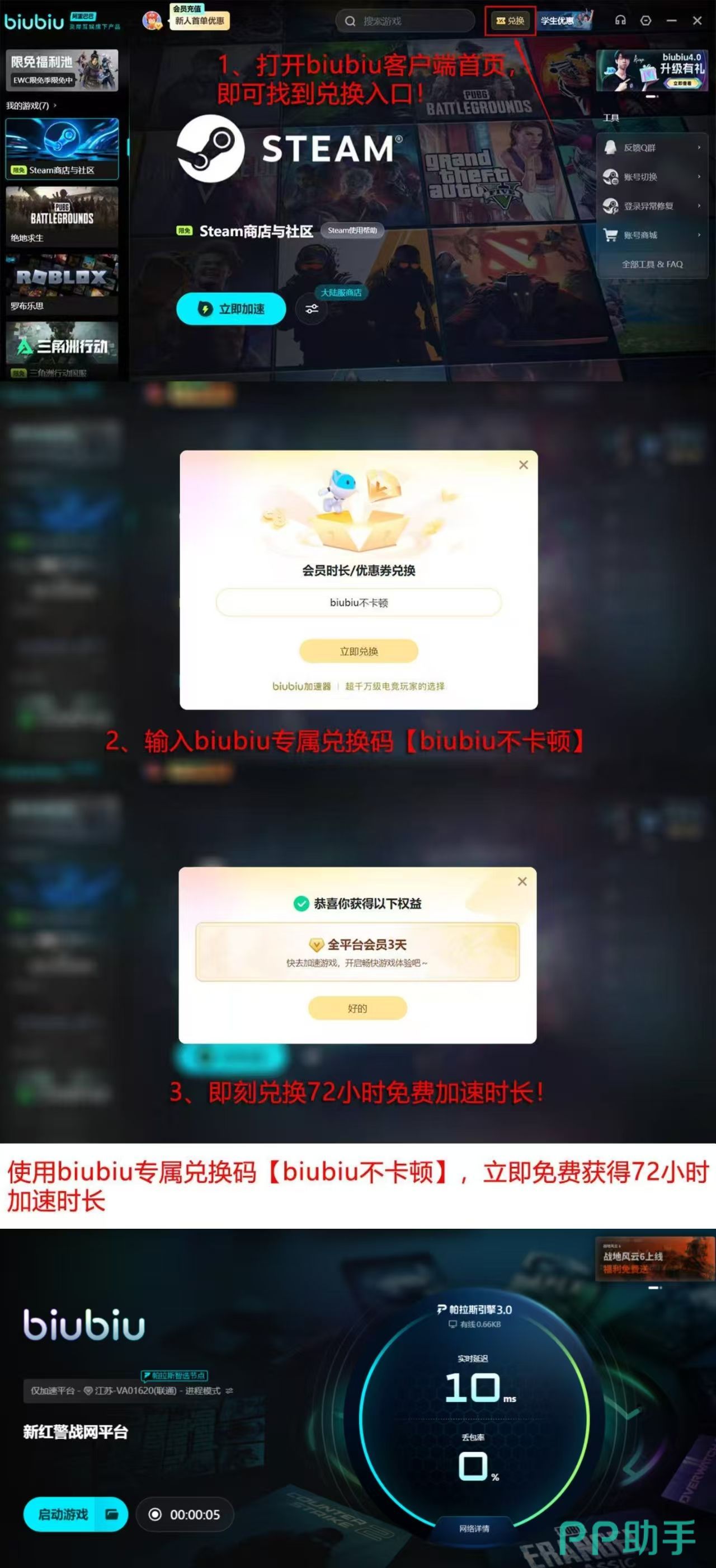 新用户注册biubiu加速器账号后,可立即领取新手大礼包,内含24小时免费加速时长;另可通过口令【biubiu不卡顿】兑换额外72小时加速服务,总计可享96小时无门槛免费使用权益,覆盖完整初体验周期。