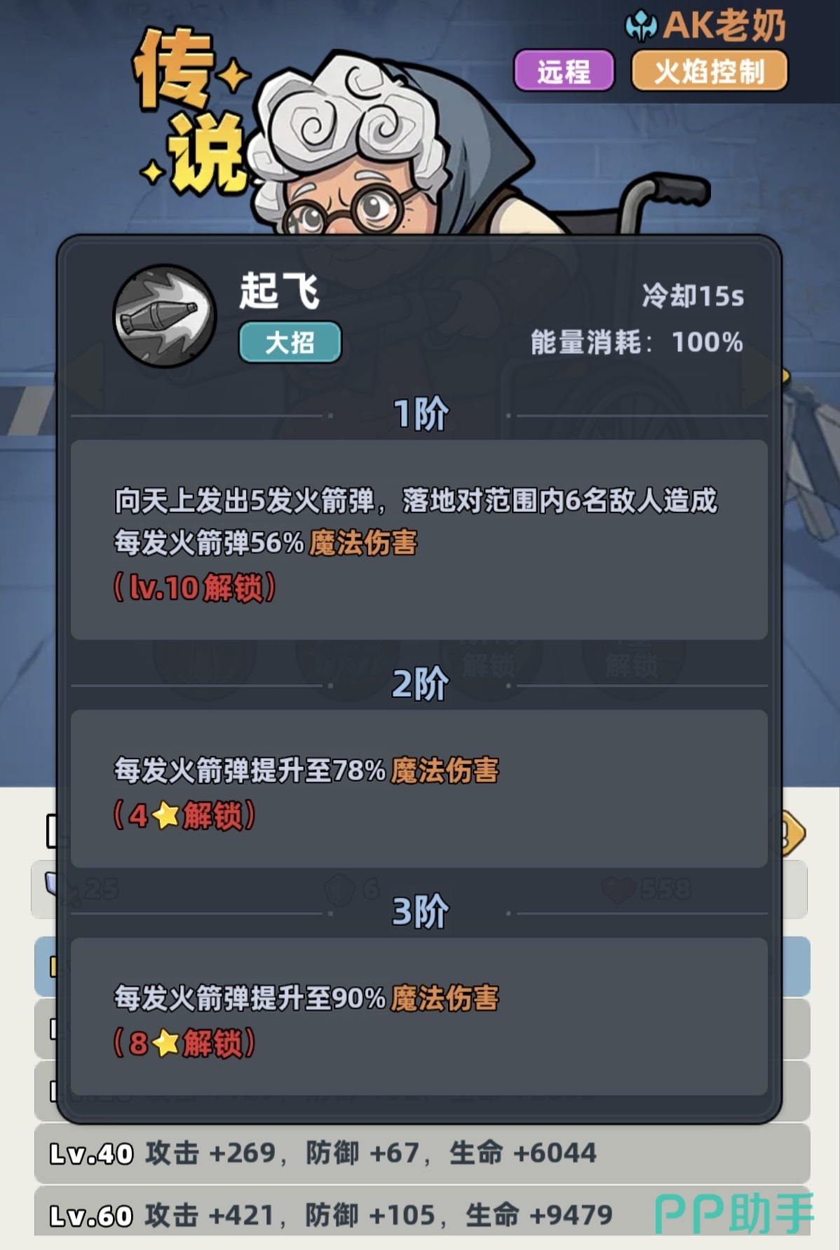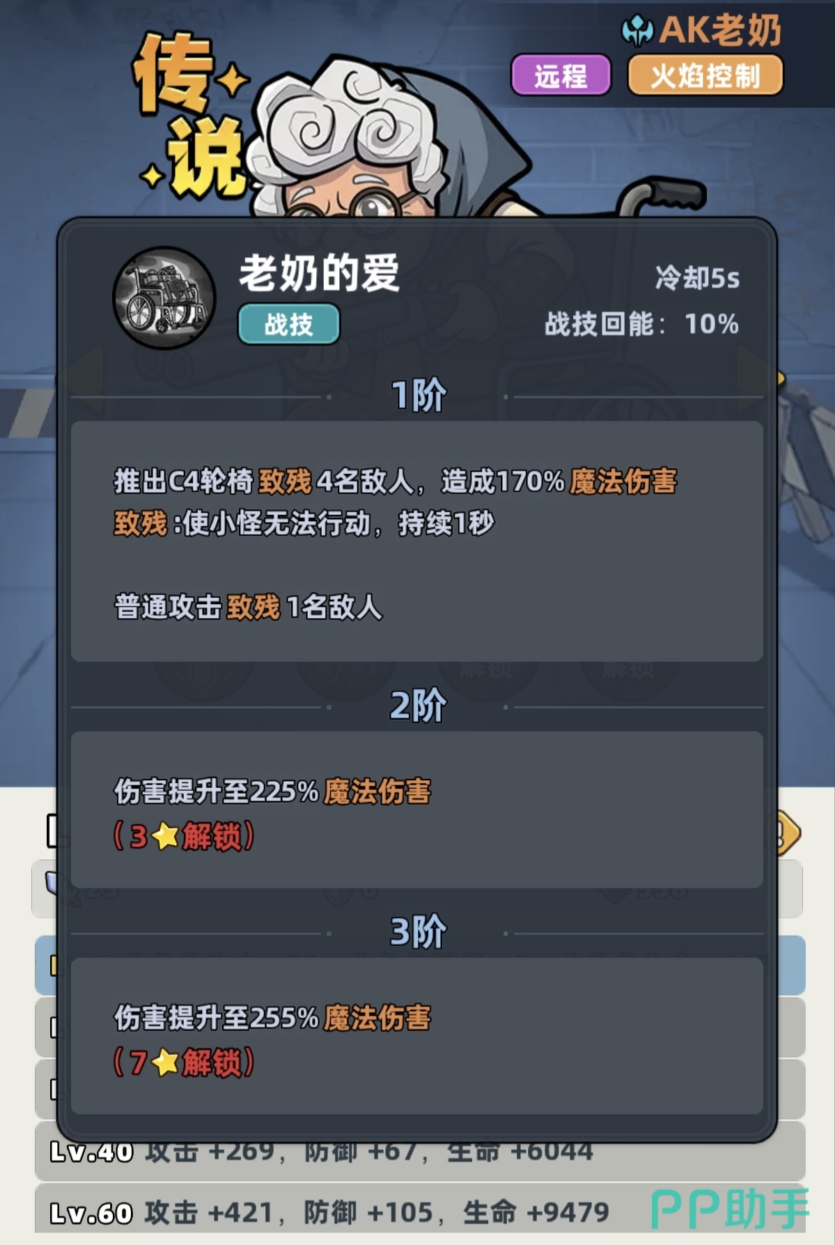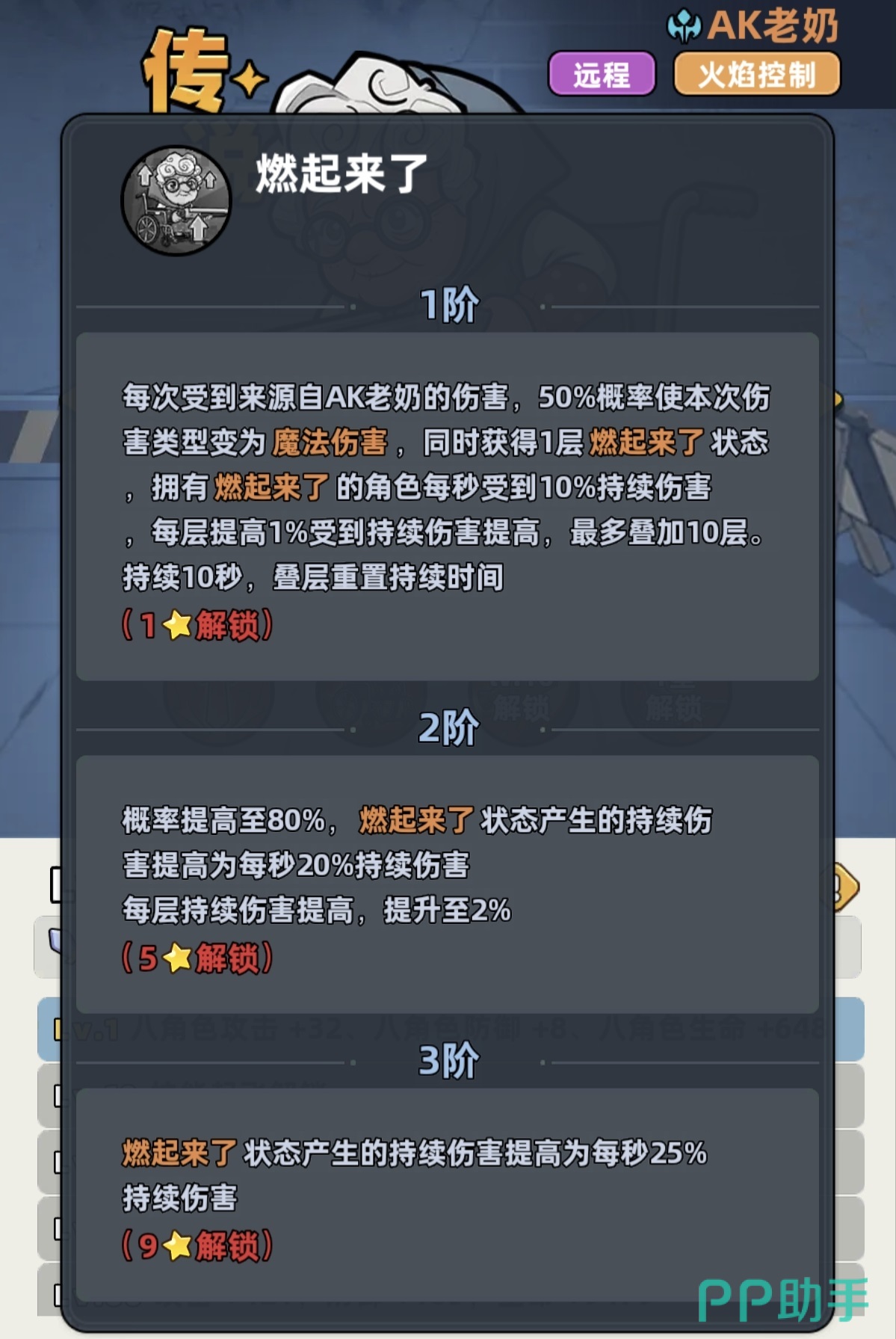 AK老奶奶虽为传说品质,但实际强度远超品质定位。其核心能力聚焦于火焰系持续伤害体系:职业特性提供25%全伤害加成,幸存者特性额外提升10%持续伤害效果。主动技能可致残四名敌方单位,造成高额魔法伤害并使其陷入无法行动状态;普通攻击亦有概率对单体目标施加致残效果,技能等级提升后魔法伤害同步增强。终极技能为向上发射火箭弹,落地后触发大范围爆炸伤害。被动机制尤为关键——所有由她造成的伤害均有概率转化为魔法伤害,并为目标附加1层燃烧状态;每层燃烧使目标每秒承受持续伤害,最高可叠加至10层。该机制决定了其输出逻辑高度依赖多段伤害叠加与状态维持,是典型的“DOT(Damage over Time)核心输出位”。