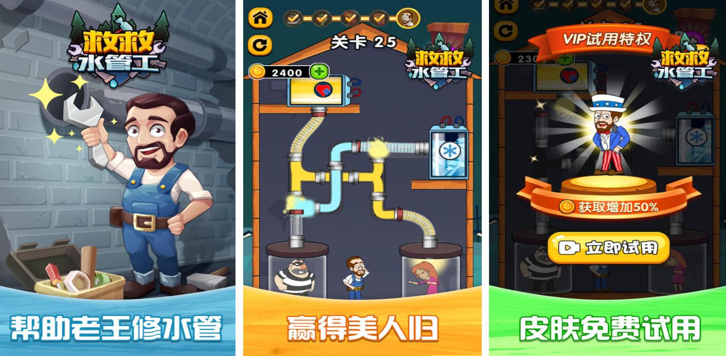 《救救水管工》这款游戏的核心任务就是拯救水管工,帮助水管工老王修水管并赢得美人。手游采用的是关卡制的模式,而每个关卡除了需要接水管外,还有各种各样的小谜题可以去完成。除接水管玩法外,手游的内还有换装模式,玩家还可以为老王更换不同的时装哦。