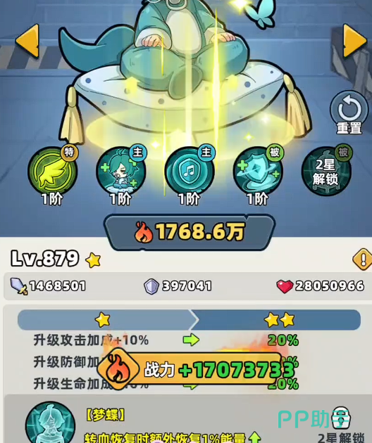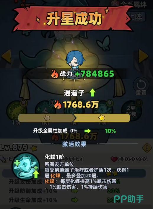 其被动技能“蝶梦无羁”为核心赋能逻辑:每当为友方单位施加治疗或护盾效果时,自动为全体我方角色叠加暴击率与攻击力增益,持续至下回合开始。该增益效果随角色星级提升而增强,每升1星,暴击率与攻击加成幅度均获得阶梯式成长,显著强化团队整体输出容错与爆发阈值。