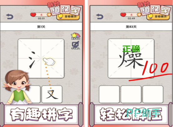 与拼汉字玩法有关的益智游戏,给大家提供了超多的关卡,每次闯关的时候,既可以通过给出的汉字填写相应的文字组建汉字,加深大家对汉字的理解,也是玩法比较轻松,给大家带来成就感的。在充满着简约以及卡通的游戏世界里,将会进入有趣的拼图世界里,闯过的关卡数量越多,自己的能力也就会越强,积累的文字也会越来越丰富。