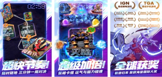 众多漫威英雄都在这里呈现,由漫威正版授权的卡牌对战游戏,集结来自于不同宇宙世界观的英雄角色,采用六回合快节奏对战,每局消耗大概仅需三分钟,比较适合利用碎片化时间游玩。双方在出牌的过程当中,回合结束同步翻牌,先手翻牌方就能够优先触发相应的效果,最终设定胜负结果。