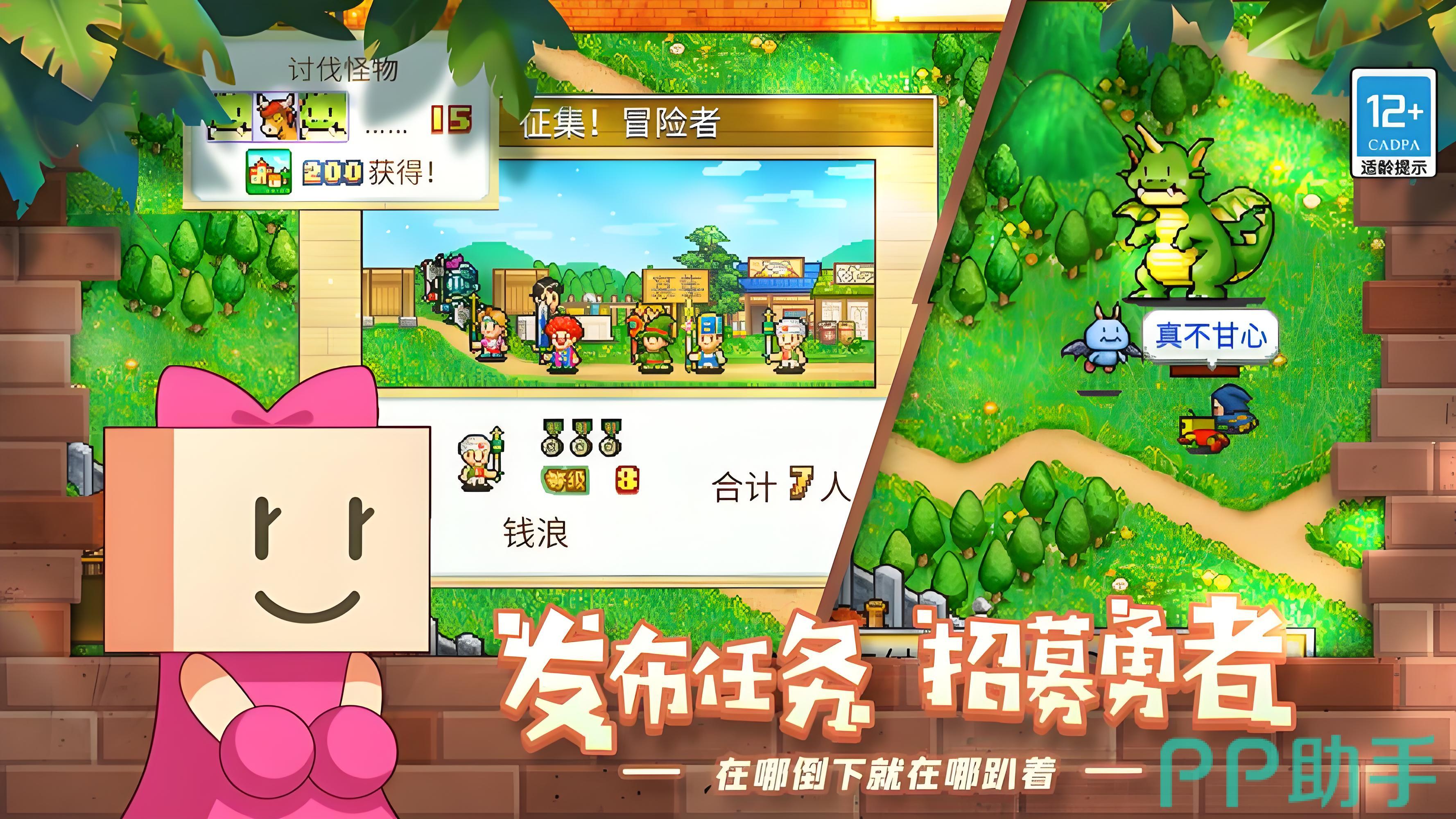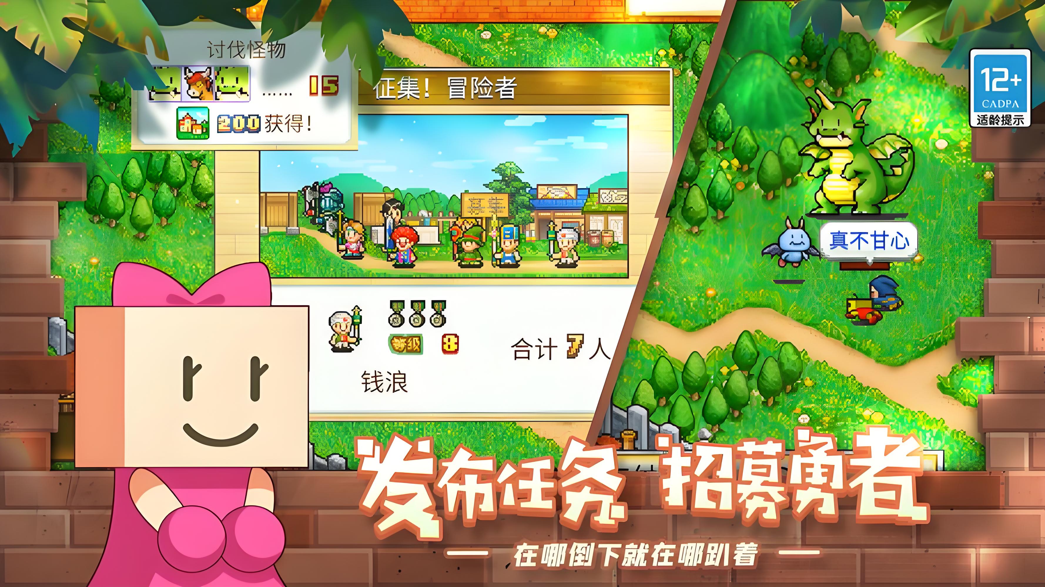 游戏将经营和RPG融合的很融洽,玩家不是直接下场砍怪,而是当一个“幕后金主“——建立旅馆、开武器店、发布任务,然后招募勇者去野外进行刷野升级。专职系统也是游戏的一大亮点,人物满十级即可转职。城镇的星级评价则是任务的核心目标,从一星到五星需要统筹兼顾。收入来源主要是靠店铺和任务奖励,勇者需要配备好的装备,变强后杀怪掉落更多的装备,以达到正向循环。