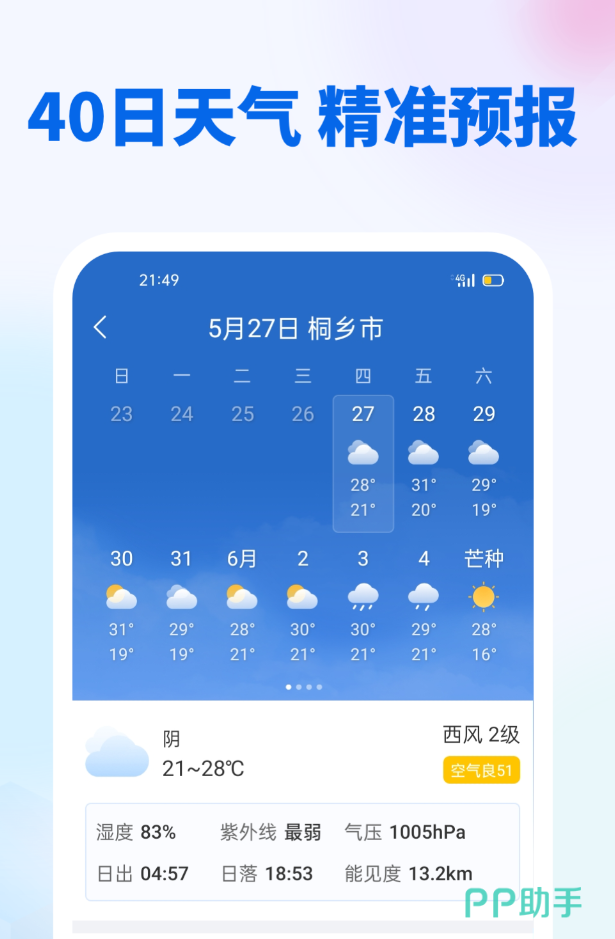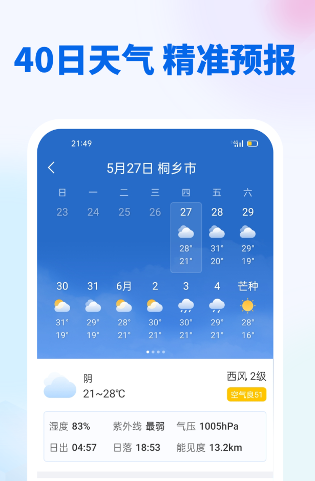 聚焦中长期天气预判,标准提供15日完整预报,延伸支持长达40日的趋势推演,适用于旅行筹备、农事安排或跨周期生活规划等场景。短临降水预报精确至分钟,24小时气温曲线可视化呈现,便于识别早晚温差。内置智能日历,整合二十四节气、法定节假日及调休安排,与天气数据联动显示;支持添加多个城市,方便远程关注亲友所在地实时气象动态。