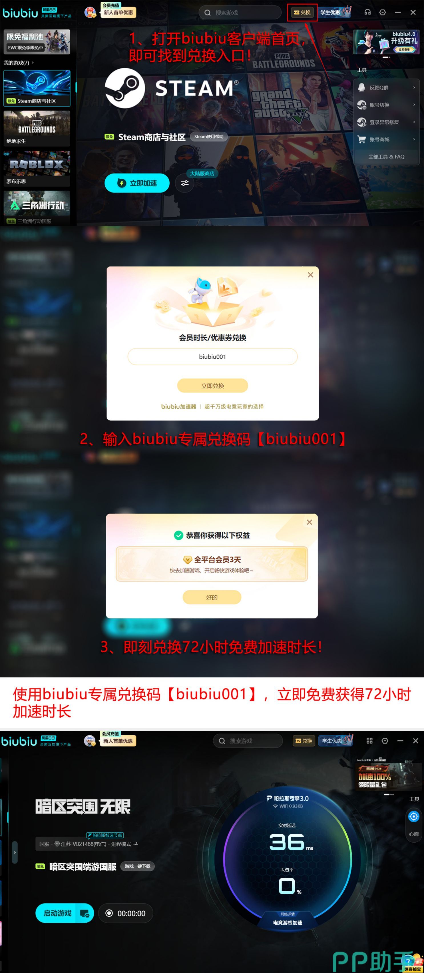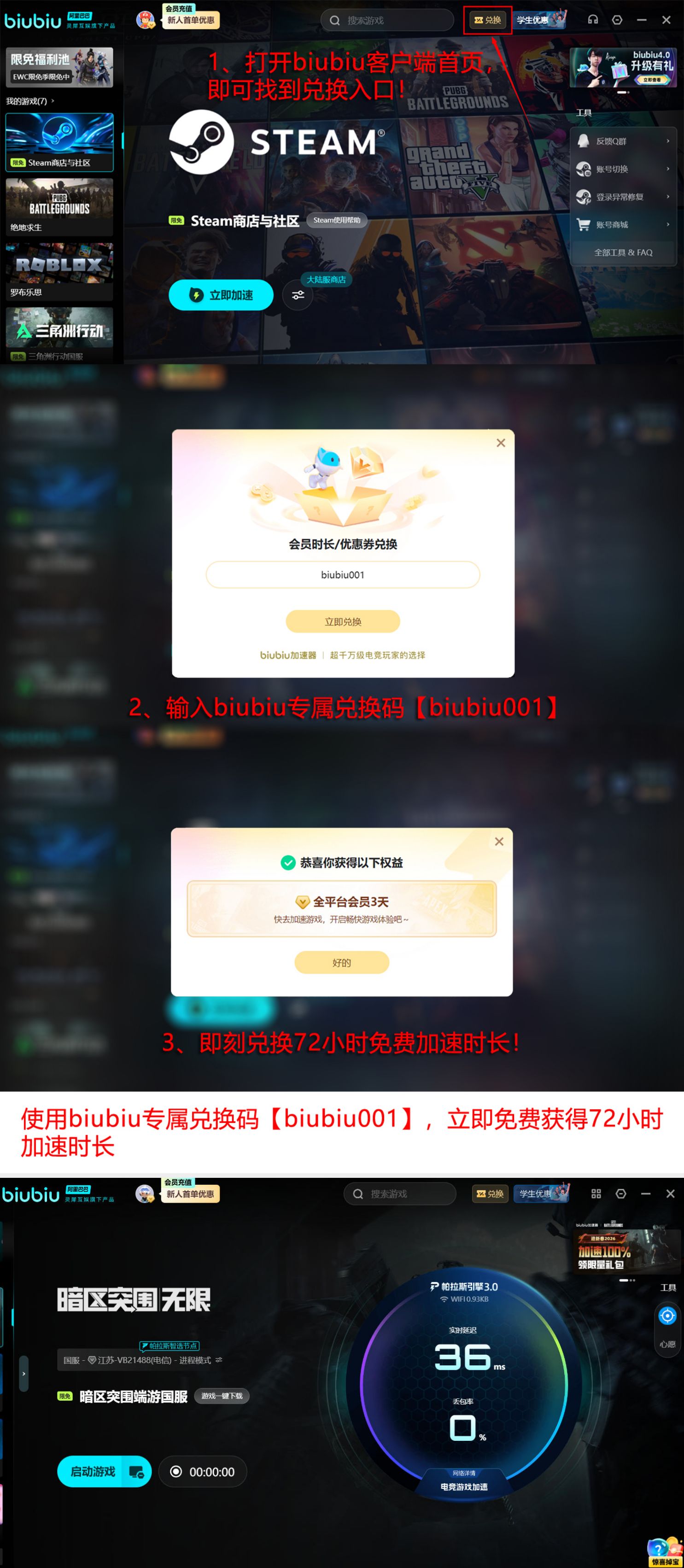 所有的玩家都可以去申请免费的加速时长,对于新用户而言,在第1次注册之后就可以享受24小时的免费礼包。输入兑换码【biubiu001】,可以得到3天的免费加速时长。这一个通用口令并非只限制于新用户,老用户也可以去申请。如果把两种方法放在一起,那新用户最高就可以免费96小时。不需要额外的付费就可以解决暗区突围网络的问题,可以很稳定的连接服务器,告别登录失败等问题。