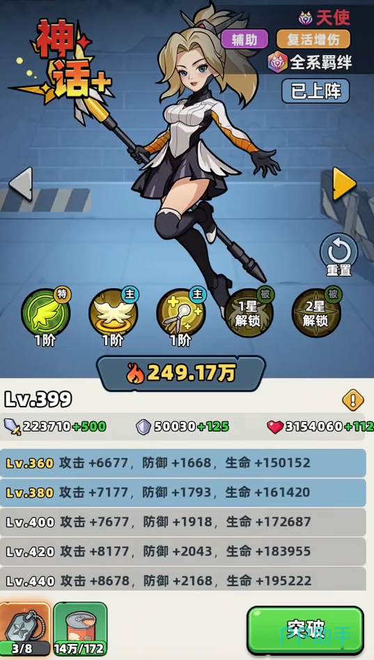 天使的核心优势在于持续性战斗加成。其被动技能可稳定提升全队攻击倍率,且效果全程生效的前提为自身未阵亡,这一特性使其成为高爆发纯输出阵容的理想核心。在主动技能层面,一技能提供高额群体治疗,治疗量随天使自身生命值比例动态成长;二技能则具备单体复活能力,每局最多释放两次,存在明确回合冷却限制。综合来看,天使更适配依赖快速压场、追求极限DPS的阵容体系。